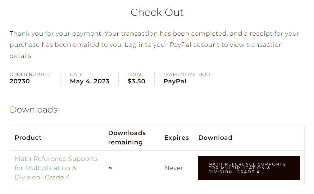 Refresh the Check Out page. Click on the black button to download your digital resource. The Check Out page should look like this: